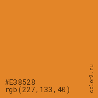 Цвет #E38528 в цветовой модели RGB обозначается тремя октетами (227, 133, 40) в десятичном формате и #E38528 в шестнадцатиричном (hex) формате, которые являются интенсивностью красного 227 (hex E3), интенсивность зелёного 133 (hex 85) и интенсивность синего 40 (hex 28).