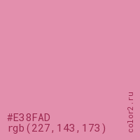 Цвет #E38FAD в цветовой модели RGB обозначается тремя октетами (227, 143, 173) в десятичном формате и #E38FAD в шестнадцатиричном (hex) формате, которые являются интенсивностью красного 227 (hex E3), интенсивность зелёного 143 (hex 8F) и интенсивность синего 173 (hex AD).