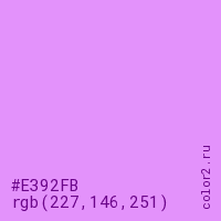 Цвет #E392FB в цветовой модели RGB обозначается тремя октетами (227, 146, 251) в десятичном формате и #E392FB в шестнадцатиричном (hex) формате, которые являются интенсивностью красного 227 (hex E3), интенсивность зелёного 146 (hex 92) и интенсивность синего 251 (hex FB).