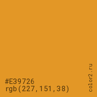 Цвет #E39726 в цветовой модели RGB обозначается тремя октетами (227, 151, 38) в десятичном формате и #E39726 в шестнадцатиричном (hex) формате, которые являются интенсивностью красного 227 (hex E3), интенсивность зелёного 151 (hex 97) и интенсивность синего 38 (hex 26).