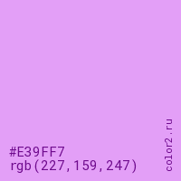 Цвет #E39FF7 в цветовой модели RGB обозначается тремя октетами (227, 159, 247) в десятичном формате и #E39FF7 в шестнадцатиричном (hex) формате, которые являются интенсивностью красного 227 (hex E3), интенсивность зелёного 159 (hex 9F) и интенсивность синего 247 (hex F7).