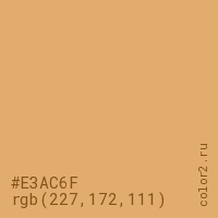 Цвет #E3AC6F в цветовой модели RGB обозначается тремя октетами (227, 172, 111) в десятичном формате и #E3AC6F в шестнадцатиричном (hex) формате, которые являются интенсивностью красного 227 (hex E3), интенсивность зелёного 172 (hex AC) и интенсивность синего 111 (hex 6F).