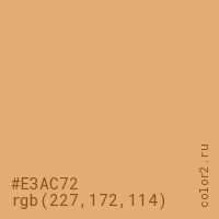 Цвет #E3AC72 в цветовой модели RGB обозначается тремя октетами (227, 172, 114) в десятичном формате и #E3AC72 в шестнадцатиричном (hex) формате, которые являются интенсивностью красного 227 (hex E3), интенсивность зелёного 172 (hex AC) и интенсивность синего 114 (hex 72).