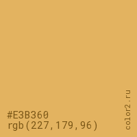 Цвет #E3B360 в цветовой модели RGB обозначается тремя октетами (227, 179, 96) в десятичном формате и #E3B360 в шестнадцатиричном (hex) формате, которые являются интенсивностью красного 227 (hex E3), интенсивность зелёного 179 (hex B3) и интенсивность синего 96 (hex 60).