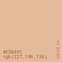 Цвет #E3BA9C в цветовой модели RGB обозначается тремя октетами (227, 186, 156) в десятичном формате и #E3BA9C в шестнадцатиричном (hex) формате, которые являются интенсивностью красного 227 (hex E3), интенсивность зелёного 186 (hex BA) и интенсивность синего 156 (hex 9C).