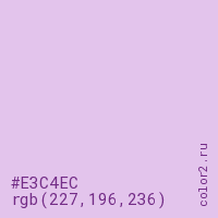 Цвет #E3C4EC в цветовой модели RGB обозначается тремя октетами (227, 196, 236) в десятичном формате и #E3C4EC в шестнадцатиричном (hex) формате, которые являются интенсивностью красного 227 (hex E3), интенсивность зелёного 196 (hex C4) и интенсивность синего 236 (hex EC).