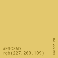 Цвет #E3C86D в цветовой модели RGB обозначается тремя октетами (227, 200, 109) в десятичном формате и #E3C86D в шестнадцатиричном (hex) формате, которые являются интенсивностью красного 227 (hex E3), интенсивность зелёного 200 (hex C8) и интенсивность синего 109 (hex 6D).
