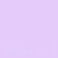 Цвет #E3CCFA в цветовой модели RGB обозначается тремя октетами (227, 204, 250) в десятичном формате и #E3CCFA в шестнадцатиричном (hex) формате, которые являются интенсивностью красного 227 (hex E3), интенсивность зелёного 204 (hex CC) и интенсивность синего 250 (hex FA).