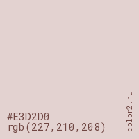 Цвет #E3D2D0 в цветовой модели RGB обозначается тремя октетами (227, 210, 208) в десятичном формате и #E3D2D0 в шестнадцатиричном (hex) формате, которые являются интенсивностью красного 227 (hex E3), интенсивность зелёного 210 (hex D2) и интенсивность синего 208 (hex D0).
