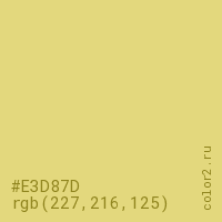 Цвет #E3D87D в цветовой модели RGB обозначается тремя октетами (227, 216, 125) в десятичном формате и #E3D87D в шестнадцатиричном (hex) формате, которые являются интенсивностью красного 227 (hex E3), интенсивность зелёного 216 (hex D8) и интенсивность синего 125 (hex 7D).
