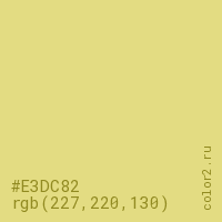 Цвет #E3DC82 в цветовой модели RGB обозначается тремя октетами (227, 220, 130) в десятичном формате и #E3DC82 в шестнадцатиричном (hex) формате, которые являются интенсивностью красного 227 (hex E3), интенсивность зелёного 220 (hex DC) и интенсивность синего 130 (hex 82).