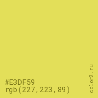 Цвет #E3DF59 в цветовой модели RGB обозначается тремя октетами (227, 223, 89) в десятичном формате и #E3DF59 в шестнадцатиричном (hex) формате, которые являются интенсивностью красного 227 (hex E3), интенсивность зелёного 223 (hex DF) и интенсивность синего 89 (hex 59).
