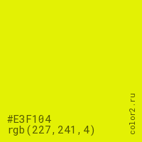Цвет #E3F104 в цветовой модели RGB обозначается тремя октетами (227, 241, 4) в десятичном формате и #E3F104 в шестнадцатиричном (hex) формате, которые являются интенсивностью красного 227 (hex E3), интенсивность зелёного 241 (hex F1) и интенсивность синего 4 (hex 04).