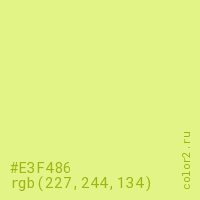 Цвет #E3F486 в цветовой модели RGB обозначается тремя октетами (227, 244, 134) в десятичном формате и #E3F486 в шестнадцатиричном (hex) формате, которые являются интенсивностью красного 227 (hex E3), интенсивность зелёного 244 (hex F4) и интенсивность синего 134 (hex 86).
