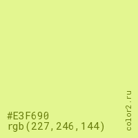 Цвет #E3F690 в цветовой модели RGB обозначается тремя октетами (227, 246, 144) в десятичном формате и #E3F690 в шестнадцатиричном (hex) формате, которые являются интенсивностью красного 227 (hex E3), интенсивность зелёного 246 (hex F6) и интенсивность синего 144 (hex 90).