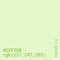 Цвет #E3F7CB в цветовой модели RGB обозначается тремя октетами (227, 247, 203) в десятичном формате и #E3F7CB в шестнадцатиричном (hex) формате, которые являются интенсивностью красного 227 (hex E3), интенсивность зелёного 247 (hex F7) и интенсивность синего 203 (hex CB).