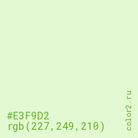 Цвет #E3F9D2 в цветовой модели RGB обозначается тремя октетами (227, 249, 210) в десятичном формате и #E3F9D2 в шестнадцатиричном (hex) формате, которые являются интенсивностью красного 227 (hex E3), интенсивность зелёного 249 (hex F9) и интенсивность синего 210 (hex D2).