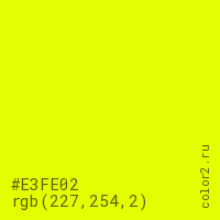 Цвет #E3FE02 в цветовой модели RGB обозначается тремя октетами (227, 254, 2) в десятичном формате и #E3FE02 в шестнадцатиричном (hex) формате, которые являются интенсивностью красного 227 (hex E3), интенсивность зелёного 254 (hex FE) и интенсивность синего 2 (hex 02).