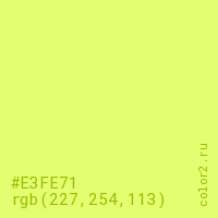 Цвет #E3FE71 в цветовой модели RGB обозначается тремя октетами (227, 254, 113) в десятичном формате и #E3FE71 в шестнадцатиричном (hex) формате, которые являются интенсивностью красного 227 (hex E3), интенсивность зелёного 254 (hex FE) и интенсивность синего 113 (hex 71).