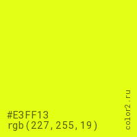 Цвет #E3FF13 в цветовой модели RGB обозначается тремя октетами (227, 255, 19) в десятичном формате и #E3FF13 в шестнадцатиричном (hex) формате, которые являются интенсивностью красного 227 (hex E3), интенсивность зелёного 255 (hex FF) и интенсивность синего 19 (hex 13).