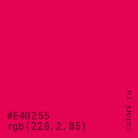 Цвет #E40255 в цветовой модели RGB обозначается тремя октетами (228, 2, 85) в десятичном формате и #E40255 в шестнадцатиричном (hex) формате, которые являются интенсивностью красного 228 (hex E4), интенсивность зелёного 2 (hex 02) и интенсивность синего 85 (hex 55).