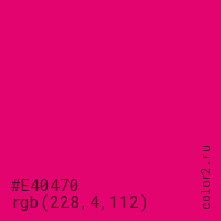 Цвет #E40470 в цветовой модели RGB обозначается тремя октетами (228, 4, 112) в десятичном формате и #E40470 в шестнадцатиричном (hex) формате, которые являются интенсивностью красного 228 (hex E4), интенсивность зелёного 4 (hex 04) и интенсивность синего 112 (hex 70).
