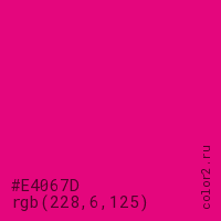 Цвет #E4067D в цветовой модели RGB обозначается тремя октетами (228, 6, 125) в десятичном формате и #E4067D в шестнадцатиричном (hex) формате, которые являются интенсивностью красного 228 (hex E4), интенсивность зелёного 6 (hex 06) и интенсивность синего 125 (hex 7D).