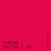 Цвет #E4074B в цветовой модели RGB обозначается тремя октетами (228, 7, 75) в десятичном формате и #E4074B в шестнадцатиричном (hex) формате, которые являются интенсивностью красного 228 (hex E4), интенсивность зелёного 7 (hex 07) и интенсивность синего 75 (hex 4B).