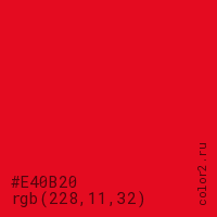 Цвет #E40B20 в цветовой модели RGB обозначается тремя октетами (228, 11, 32) в десятичном формате и #E40B20 в шестнадцатиричном (hex) формате, которые являются интенсивностью красного 228 (hex E4), интенсивность зелёного 11 (hex 0B) и интенсивность синего 32 (hex 20).
