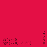 Цвет #E40F45 в цветовой модели RGB обозначается тремя октетами (228, 15, 69) в десятичном формате и #E40F45 в шестнадцатиричном (hex) формате, которые являются интенсивностью красного 228 (hex E4), интенсивность зелёного 15 (hex 0F) и интенсивность синего 69 (hex 45).