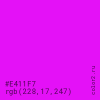 Цвет #E411F7 в цветовой модели RGB обозначается тремя октетами (228, 17, 247) в десятичном формате и #E411F7 в шестнадцатиричном (hex) формате, которые являются интенсивностью красного 228 (hex E4), интенсивность зелёного 17 (hex 11) и интенсивность синего 247 (hex F7).