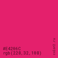 Цвет #E4206C в цветовой модели RGB обозначается тремя октетами (228, 32, 108) в десятичном формате и #E4206C в шестнадцатиричном (hex) формате, которые являются интенсивностью красного 228 (hex E4), интенсивность зелёного 32 (hex 20) и интенсивность синего 108 (hex 6C).