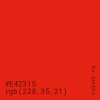 Цвет #E42315 в цветовой модели RGB обозначается тремя октетами (228, 35, 21) в десятичном формате и #E42315 в шестнадцатиричном (hex) формате, которые являются интенсивностью красного 228 (hex E4), интенсивность зелёного 35 (hex 23) и интенсивность синего 21 (hex 15).