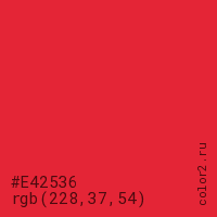 Цвет #E42536 в цветовой модели RGB обозначается тремя октетами (228, 37, 54) в десятичном формате и #E42536 в шестнадцатиричном (hex) формате, которые являются интенсивностью красного 228 (hex E4), интенсивность зелёного 37 (hex 25) и интенсивность синего 54 (hex 36).