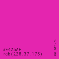 Цвет #E425AF в цветовой модели RGB обозначается тремя октетами (228, 37, 175) в десятичном формате и #E425AF в шестнадцатиричном (hex) формате, которые являются интенсивностью красного 228 (hex E4), интенсивность зелёного 37 (hex 25) и интенсивность синего 175 (hex AF).