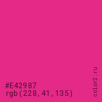 Цвет #E42987 в цветовой модели RGB обозначается тремя октетами (228, 41, 135) в десятичном формате и #E42987 в шестнадцатиричном (hex) формате, которые являются интенсивностью красного 228 (hex E4), интенсивность зелёного 41 (hex 29) и интенсивность синего 135 (hex 87).
