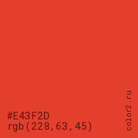 Цвет #E43F2D в цветовой модели RGB обозначается тремя октетами (228, 63, 45) в десятичном формате и #E43F2D в шестнадцатиричном (hex) формате, которые являются интенсивностью красного 228 (hex E4), интенсивность зелёного 63 (hex 3F) и интенсивность синего 45 (hex 2D).