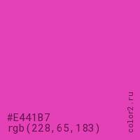 Цвет #E441B7 в цветовой модели RGB обозначается тремя октетами (228, 65, 183) в десятичном формате и #E441B7 в шестнадцатиричном (hex) формате, которые являются интенсивностью красного 228 (hex E4), интенсивность зелёного 65 (hex 41) и интенсивность синего 183 (hex B7).