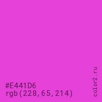 Цвет #E441D6 в цветовой модели RGB обозначается тремя октетами (228, 65, 214) в десятичном формате и #E441D6 в шестнадцатиричном (hex) формате, которые являются интенсивностью красного 228 (hex E4), интенсивность зелёного 65 (hex 41) и интенсивность синего 214 (hex D6).