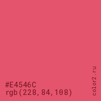 Цвет #E4546C в цветовой модели RGB обозначается тремя октетами (228, 84, 108) в десятичном формате и #E4546C в шестнадцатиричном (hex) формате, которые являются интенсивностью красного 228 (hex E4), интенсивность зелёного 84 (hex 54) и интенсивность синего 108 (hex 6C).