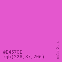 Цвет #E457CE в цветовой модели RGB обозначается тремя октетами (228, 87, 206) в десятичном формате и #E457CE в шестнадцатиричном (hex) формате, которые являются интенсивностью красного 228 (hex E4), интенсивность зелёного 87 (hex 57) и интенсивность синего 206 (hex CE).
