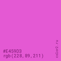 Цвет #E459D3 в цветовой модели RGB обозначается тремя октетами (228, 89, 211) в десятичном формате и #E459D3 в шестнадцатиричном (hex) формате, которые являются интенсивностью красного 228 (hex E4), интенсивность зелёного 89 (hex 59) и интенсивность синего 211 (hex D3).