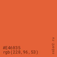 Цвет #E46035 в цветовой модели RGB обозначается тремя октетами (228, 96, 53) в десятичном формате и #E46035 в шестнадцатиричном (hex) формате, которые являются интенсивностью красного 228 (hex E4), интенсивность зелёного 96 (hex 60) и интенсивность синего 53 (hex 35).