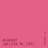 Цвет #E46087 в цветовой модели RGB обозначается тремя октетами (228, 96, 135) в десятичном формате и #E46087 в шестнадцатиричном (hex) формате, которые являются интенсивностью красного 228 (hex E4), интенсивность зелёного 96 (hex 60) и интенсивность синего 135 (hex 87).