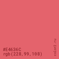 Цвет #E4636C в цветовой модели RGB обозначается тремя октетами (228, 99, 108) в десятичном формате и #E4636C в шестнадцатиричном (hex) формате, которые являются интенсивностью красного 228 (hex E4), интенсивность зелёного 99 (hex 63) и интенсивность синего 108 (hex 6C).