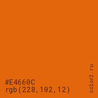 Цвет #E4660C в цветовой модели RGB обозначается тремя октетами (228, 102, 12) в десятичном формате и #E4660C в шестнадцатиричном (hex) формате, которые являются интенсивностью красного 228 (hex E4), интенсивность зелёного 102 (hex 66) и интенсивность синего 12 (hex 0C).