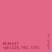 Цвет #E46687 в цветовой модели RGB обозначается тремя октетами (228, 102, 135) в десятичном формате и #E46687 в шестнадцатиричном (hex) формате, которые являются интенсивностью красного 228 (hex E4), интенсивность зелёного 102 (hex 66) и интенсивность синего 135 (hex 87).