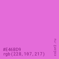 Цвет #E46BD9 в цветовой модели RGB обозначается тремя октетами (228, 107, 217) в десятичном формате и #E46BD9 в шестнадцатиричном (hex) формате, которые являются интенсивностью красного 228 (hex E4), интенсивность зелёного 107 (hex 6B) и интенсивность синего 217 (hex D9).