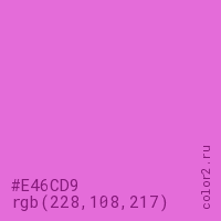 Цвет #E46CD9 в цветовой модели RGB обозначается тремя октетами (228, 108, 217) в десятичном формате и #E46CD9 в шестнадцатиричном (hex) формате, которые являются интенсивностью красного 228 (hex E4), интенсивность зелёного 108 (hex 6C) и интенсивность синего 217 (hex D9).