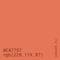 Цвет #E47757 в цветовой модели RGB обозначается тремя октетами (228, 119, 87) в десятичном формате и #E47757 в шестнадцатиричном (hex) формате, которые являются интенсивностью красного 228 (hex E4), интенсивность зелёного 119 (hex 77) и интенсивность синего 87 (hex 57).